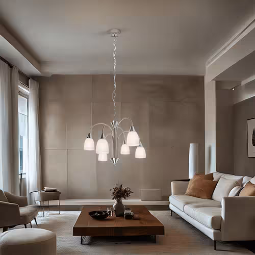Schakel de kroonluchter uit, laat hem afkoelen en veeg de oppervlakken voorzichtig af met een zachte, pluisvrije doek. Voor moeilijk bereikbare plaatsen kan een plumeau of een speciale reinigingsvloeistof worden gebruikt. Glasreiniger is soms geschikt voor kristallen kroonluchters om de glans te behouden.