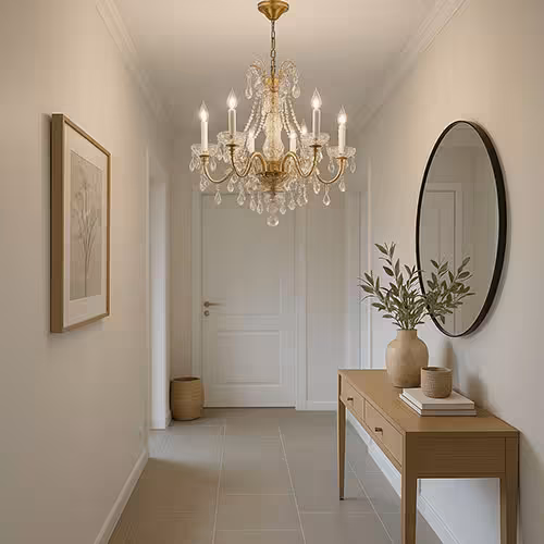 Een kroonluchter heeft ruimte en hoogte nodig - plan voldoende afstand tot het plafond. Het lichteffect is vaak warm en diffuus - ideaal om een gezellige sfeer te creëren in de entree.