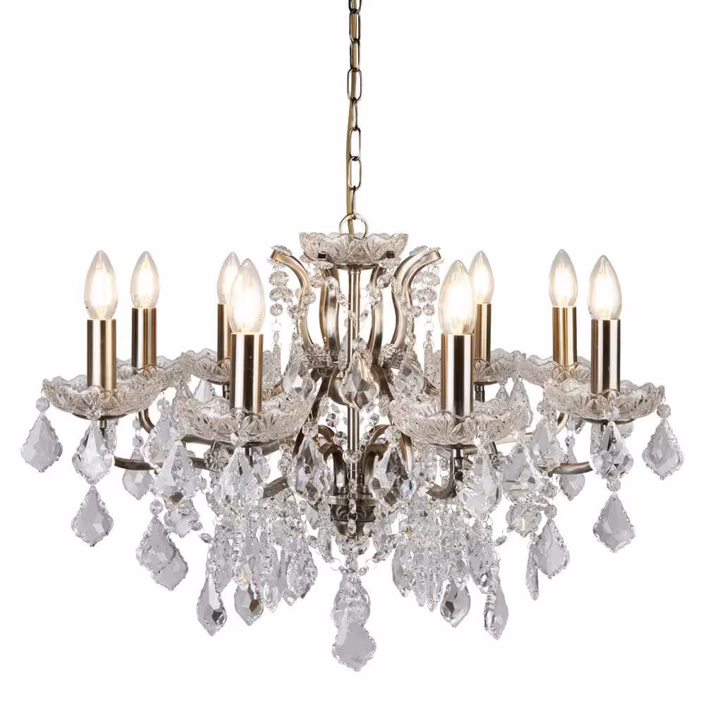 Typisch zijn de filigraan glazen armen. Ze vormen de basisstructuur waaraan de kristallen hangers elegant hangen. De kristallen breken het licht en creëren een unieke schittering - bijna zoals zonnestralen in een waterdruppel. Elke hoek onthult nieuwe reflecties.